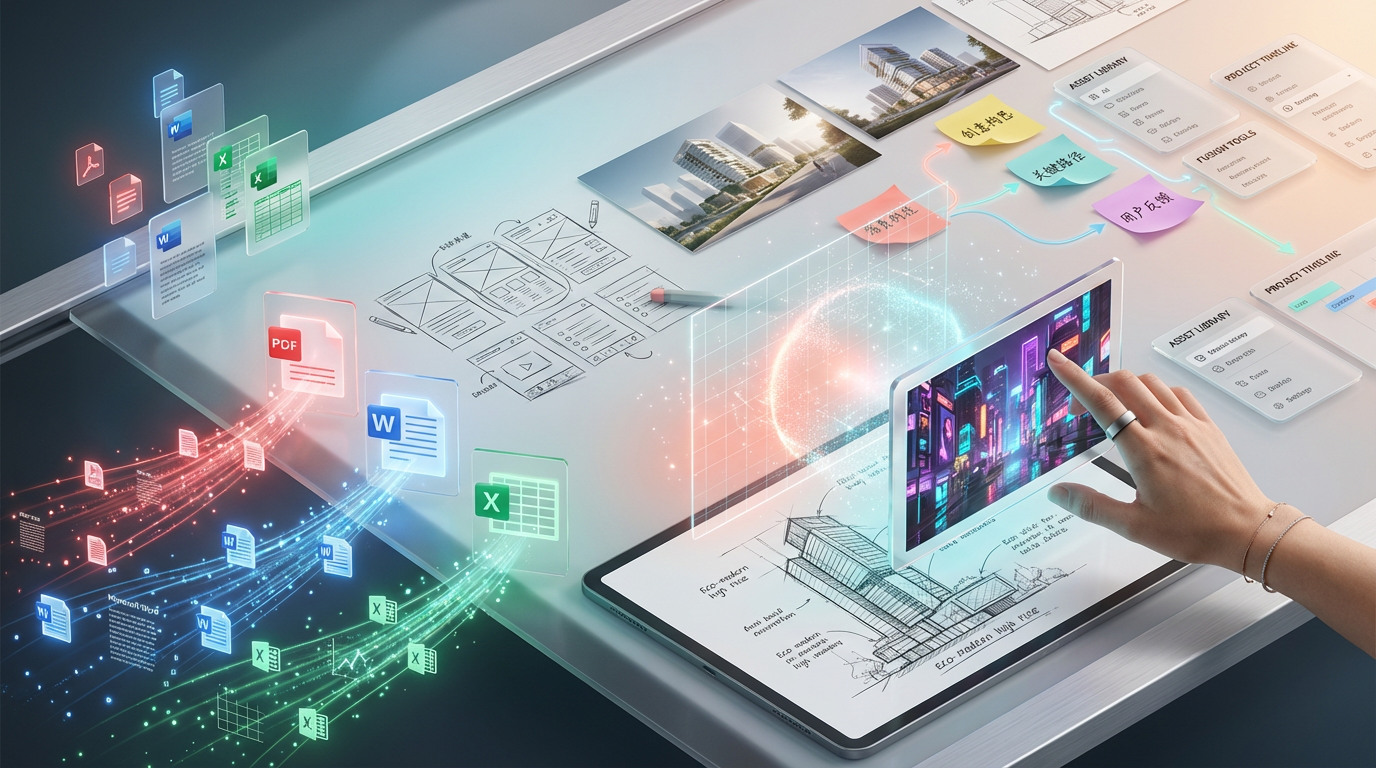 Memory记忆库:PDF、Word、Excel、PPT上传即可用,语义搜索穿透格式。Assets资产库:Logo、品牌色、字体,拖进画布自动应用规范。